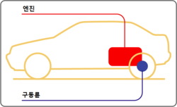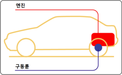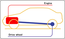 프론트 엔진 리어 드라이브 방식(FR) 프론트 엔진 후륜구동 방식(FR)은 보통 엔진의 위치가 승용차는 차체 앞부분에(트럭은 좌석 아랫부분에) 있는데, 프로펠러 샤프트를 통하여 회전력을 뒤로 보내 뒷바퀴를 회전시키는 방식이다. 따라서 FR 차량들은 엔진을 세로로 배치한다. 승용차에서는 비교적 큰 엔진이 있는 대형차나 스포츠카에 채용되는 경우가 많다. 또한, 짐을 실어 나르는 것이 주된 목적의 자동차인 트럭의 경우에도 굳이 FF로 하여 얻는 이점이 없기 때문에 보통은 FR 방식으로 되어 있다.