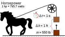 마력(馬力, hp, ps)은 일률의 단위이다. 마력은 정의에 따라 그 기준이 달라 SI 단위인 와트가 보다 더 널리 쓰인다. 마력은 자동차 산업에서 내연 기관의 일률을 나타내는 단위로 주로 쓴다. 일반적으로 hp를 많이 사용한다. 마력은 영국의 기준으로 1 hp(horsepower) = 745.7W이며, 독일의 기준으로는 1 ps(pferdestärke) = 735.5W이다. 영국식 마력(hp)은 제임스 와트가 개발한 증기 기관의 성능을 재기 위해 도입했다. 이때 1마력은 영국식 단위계인 야드파운드법에 따라 길이의 단위 피트(1ft=0.3048m)와 질량의 단위 파운드(1lb=453.599082g)를 써서 550ft·lb_f/sec가 되었다. 이것을 다른 일률 단위인 와트(W)로 환산하면, 영국에서 중력 가속도(g)의 값은 9.8119m/s²이므로 1 hp=550×0.3048×0.453592×9.8119 = 약 745.7W가 된 것이다. 1마력은 이것이 설정된 1765년 당시 영국산 말 한 마리가 할 수 있는 일률이었다. 하지만 영국의 야드파운드법 대신 미터법을 사용하는 독일, 프랑스 등 유럽에서는 미터 단위를 적용해 프랑스 마력(ps)이 나왔다. 1초 동안 질량 75kg의 물체를 1m 들어올리는 일률로 1PS = 75kgf·m/s = 75 × 9.80665N·m/s = 약 735.5W가 되었다.